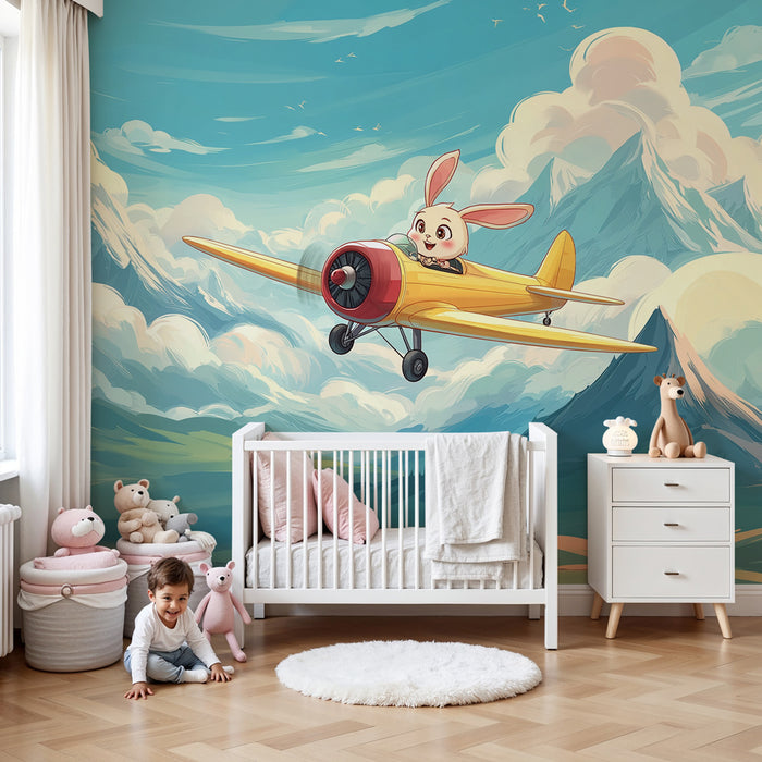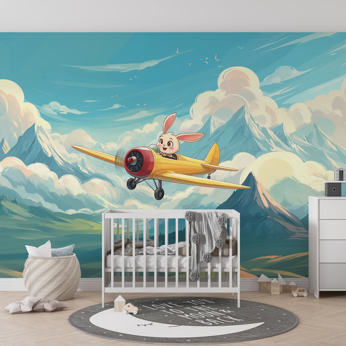 Få barnet ditt til å oppdage den fascinerende verden av luftfart med denne barnerom tapet som viser en søt kanin med store ører som flyr sitt gule fly gjennom en azurblå himmel. Majestetiske fjell og myke skyer skaper en fortryllende atmosfære som stimulerer fantasi og eventyr.