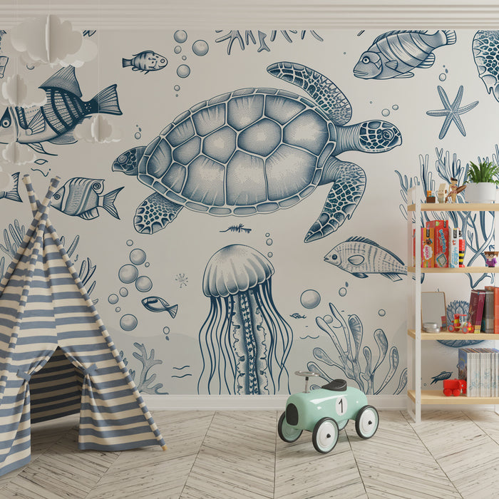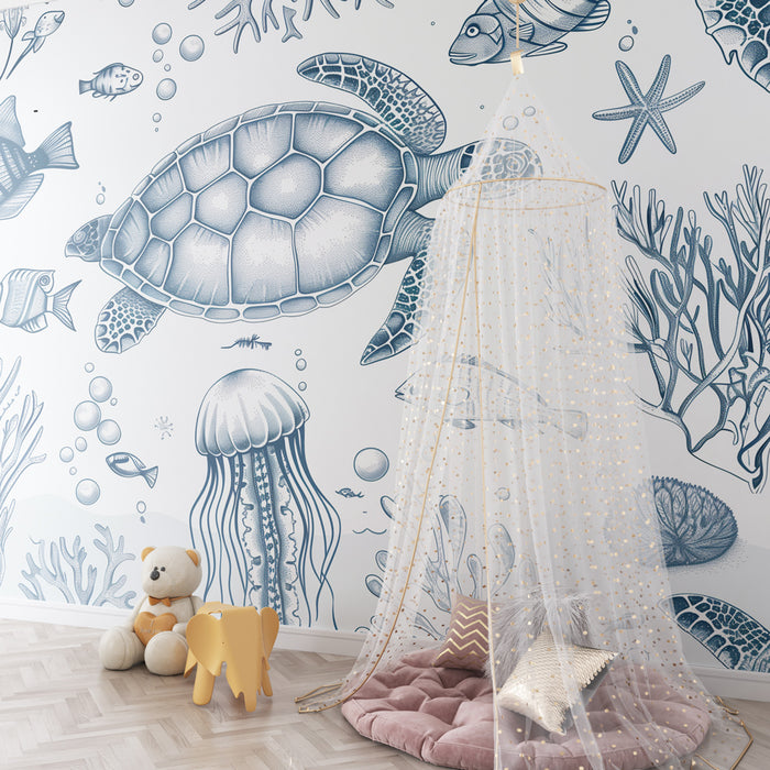 Dette tapetet avslører et raffinert design i nyanser av dypt blått og strålende hvitt, som fremhever hver detalj av de skjellkledde havskilpaddene, tropiske fisker og fint tegnede koraller. Helheten skaper en fredelig og omsluttende atmosfære, perfekt for et barnerom hvor man kan drømme og utforske. Spill av teksturer og kontraster minner om vintageillustrasjoner, og tilfører en tidløs eleganse til dekorasjonen.
