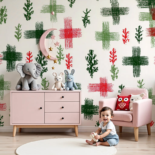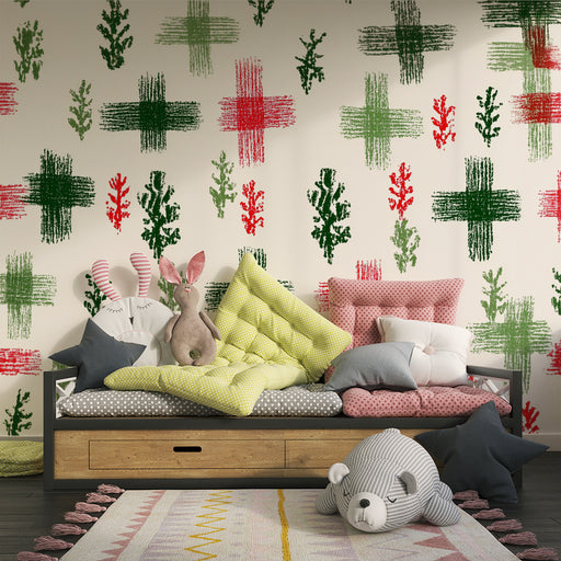 KidsWallGi barnets rom et lekent og kunstnerisk preg med vår fargede kors og løv tapet. Dette unike designet har kors i røde og grønne nyanser, supplert me...