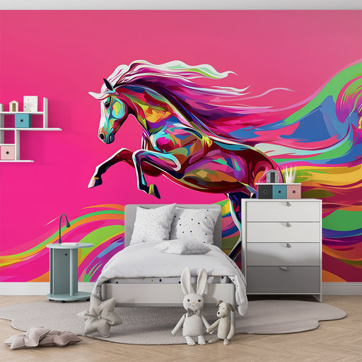 KidsWallTransformér barnets rom med vår flerfarget bevegelig hestetapet. Dette levende og energiske designet viser en majestetisk hest innhyllet i dynamis...