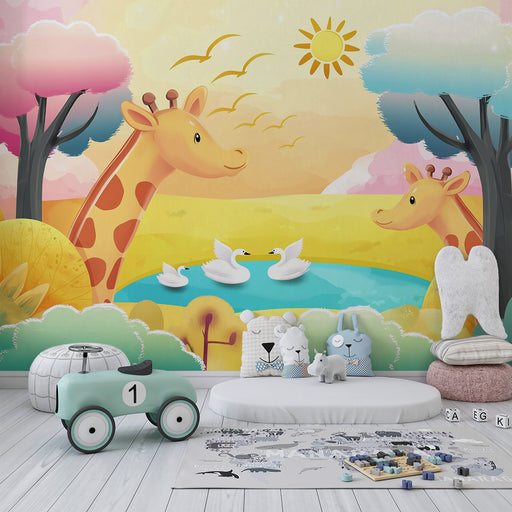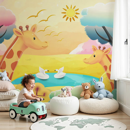 Vis alle detaljerTapet barnerom | Giraffer og svaner ved vannkanten