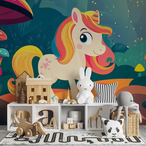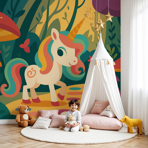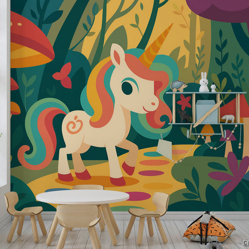 KidsWallTransformér barnets rom til en magisk verden med vår enhjørning tapet og eventyrlige sopp. Dette levende tapetet viser en søt enhjørning midt i far...