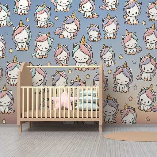 Vis alle detaljerTapet barnerom | Pastell enhjørninger og blå stjerner