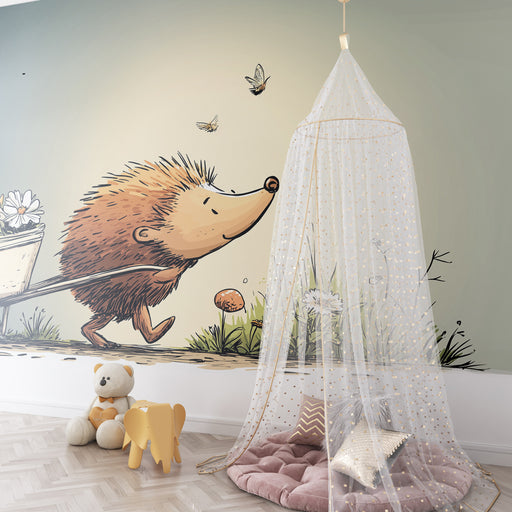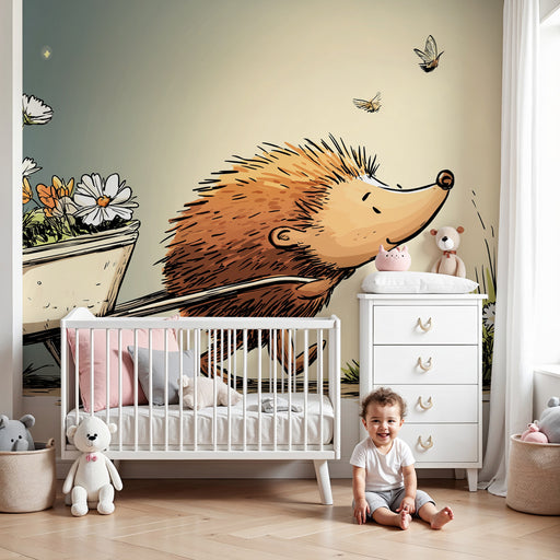 Bring en touch av natur og uskyldighet inn i barnets rom med denne barnerom tapetet. En elskelig pinnsvin drar en trillebår full av fargerike bloms...