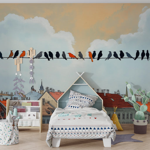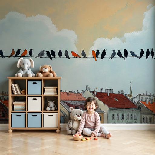 Gi barnets rom et snev av glede og naturlighet med denne barnerom tapet som viser fargerike fugler som sitter på en strømledning. Disse sjarmerende...