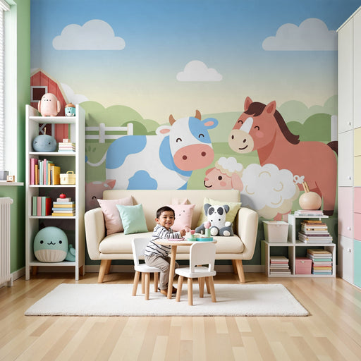 KidsWallTransformér barnets rom med denne barnetapeten som illustrerer en søt og fargerik scene fra livet på gården. Oppdag sjarmerende dyr, inkludert en r...