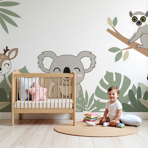 KidsWallSkap en leken og fortryllende atmosfære på barnets rom med denne barnetapeten fylt med sjarmerende jungeldyr. En søt koala koser seg i midten mens ...