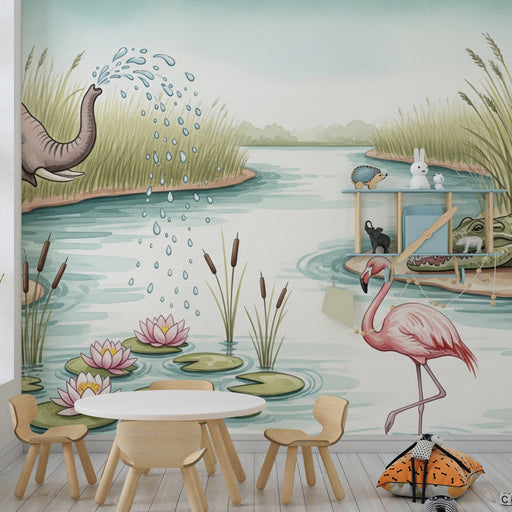 KidsWallDykk inn i den fascinerende verden av dyrelivet med denne tapetet for barn som viser en nysgjerrig alligator som dukker opp fra en livlig vannlands...