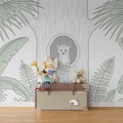 Vis alle detaljerTapet barnerom | Nysgjerrig leopard i jungelen