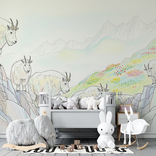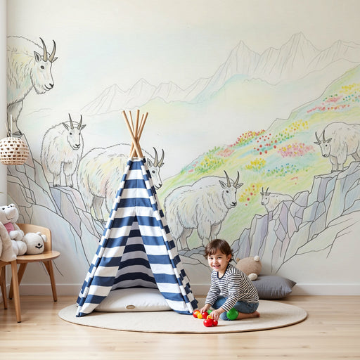 KidsWallForvandle barnets rom til en magisk fjellkongerike med denne tapet inspirert av fjellgeiter. Nøye illustrert, viser dette dekoret en gruppe hvitpel...
