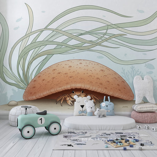 KidsWallDykk ned i en levende undervannsverden med denne tapeten for barn som illustrerer en luring krabbe under et eksotisk skjell. Omgitt av myke marine ...