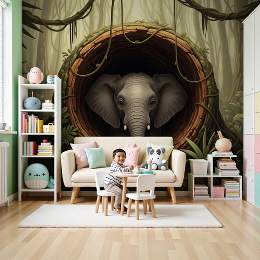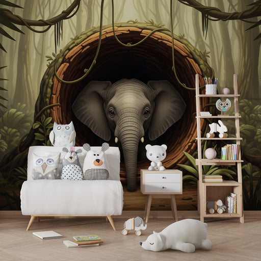 KidsWallEmbarquez votre enfant dans une aventure sauvage avec ce barnerom tapet illustrant un majestueux éléphant émergeant d'un tronc d'arbre dans une jun...