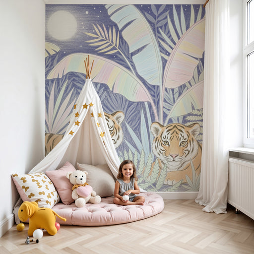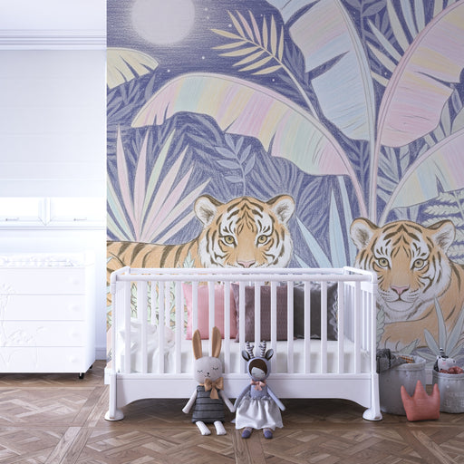 KidsWallVekk barnets fantasi med denne tapetet for barnerom som illustrerer to tigre fredelig plassert i et tropisk nattlandskap. Under det milde lyset fra...