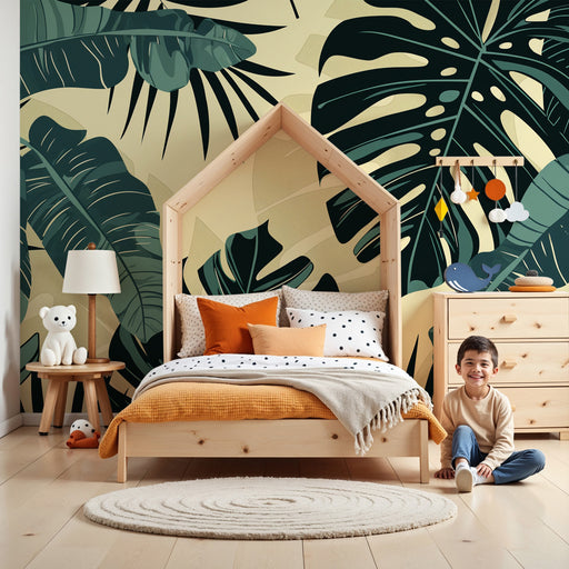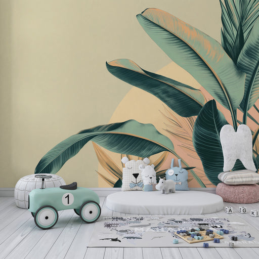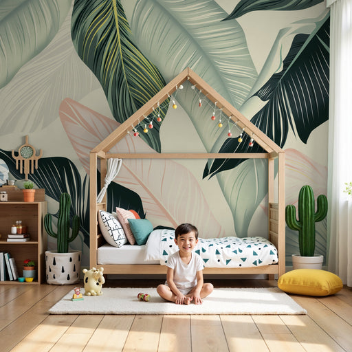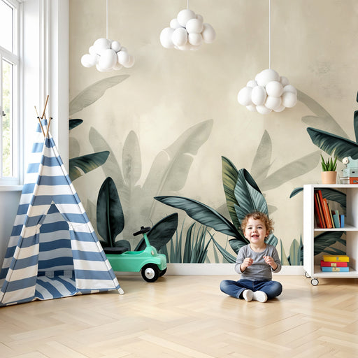 KidsWallRedesign barnerommet med denne barnerom tapet med elegante tropiske bladmotiver. De store bladene i myke nyanser av grønt og beige skaper en beroli...