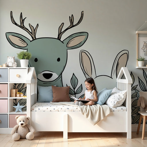 KidsWallSkap en myk og beroligende atmosfære på barnets rom med denne barnerom tapet som viser en sjarmerende hjort og kanin. Omgitt av delikate blader i n...