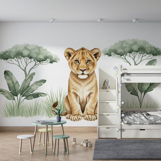 KidsWallForvandle barnets rom til en ekte savanne med dette barnerom tapetet som illustrerer en søt liten løveunge med et livlig blikk. Omgitt av frodige b...