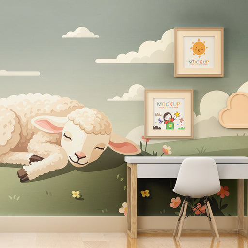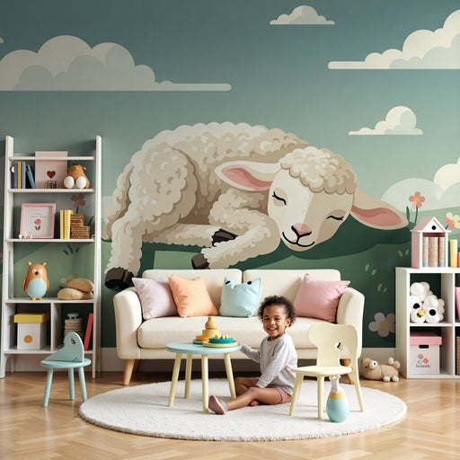 KidsWallSkap en fredelig og drømmende atmosfære på barnets rom med denne tapet inspirert av fortryllende landskap. I midten av veggen er et sjarmerende sau...