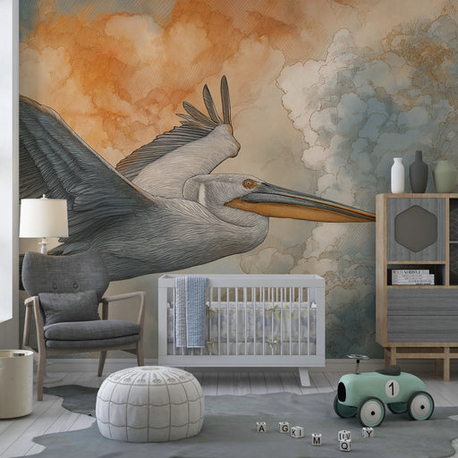 KidsWallStig ombord på et beroligende eventyr på barnets rom med denne barnerom tapetet som viser en pelikan i full flyvning. De detaljerte fjærene og den ...