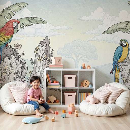 KidsWallStig inn i en tropisk eventyr med denne tapetet for barnerom som viser to vakre papegøyer. På en bakgrunn av grønt landskap, legger disse skinnende...