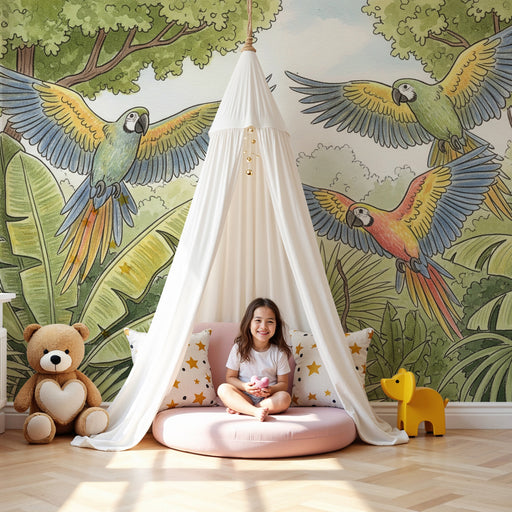 Vis alle detaljerTapet barnerom | Fargerike papegøyer midt i naturen