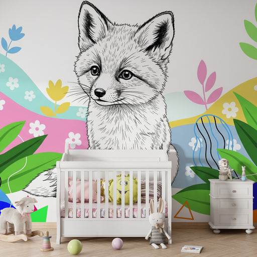 Vis alle detaljerTapet barnerom | Søt rev midt i fargerik natur