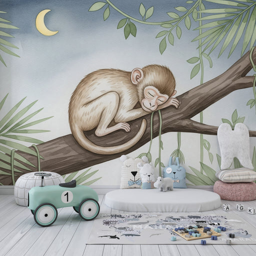 KidsWallOppdag en fredelig og fortryllende verden med denne tapeten for barn som viser en søt apekatt som sover på en gren. Omgitt av frodige blader og et ...