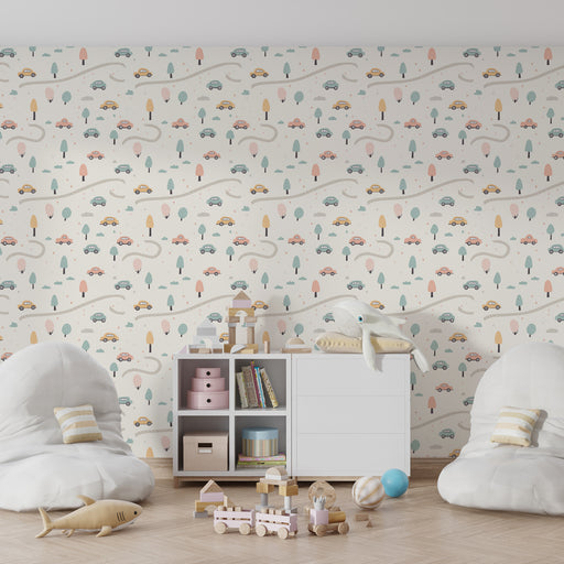 Tapet barnerom med mønster | Svingete vei med fargerike biler og delikate trær