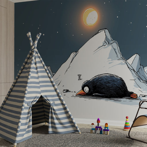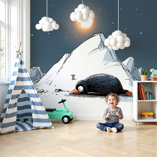 KidsWallTransformér barnets rom med denne barnerom tapet som viser en søt pingvin som sover på en snødekt scene. Med majestetiske fjell i bakgrunnen og en ...