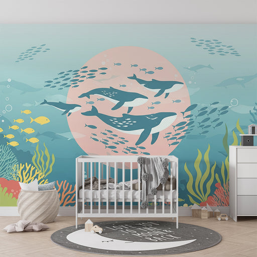 Vis alle detaljerTapet barnerom | Havunivers med hvaler og fargerike koraller