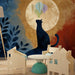 Dette tapetet med katt og måne fanger den mystiske skjønnheten av natten. Silhuetten av en katt som sitter på en ås, omgitt av løvverk, skjærer seg elegant ut mot en stor fullmåne. Nyansene av blått og oker kontrasterer harmonisk, og legger til en kunstnerisk og drømmende touch til ethvert interiør.