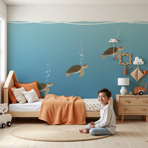 KidsWallZanurz się w kojącym wodnym uniwersum z tą tapetą dla dzieci, na której przedstawione są urocze morskie żółwie pływające między koralami. Jasnonieb...