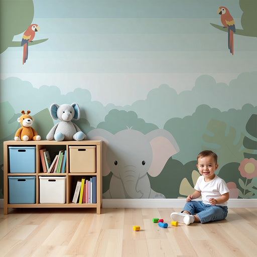 KidsWallPrzekształć pokój swojego dziecka w prawdziwy azyl natury dzięki temu tapetowi dla dzieci, na którym przedstawiony jest uroczy słonik w sercu bujne...