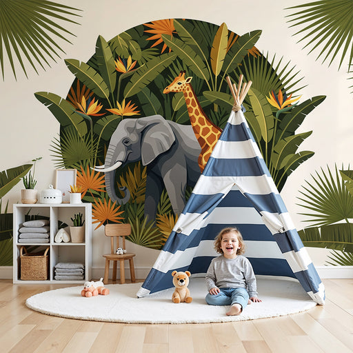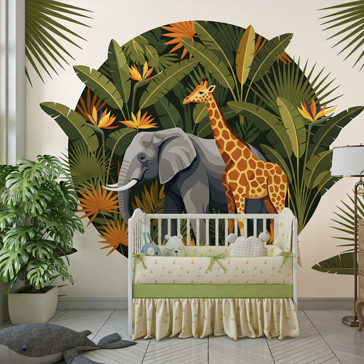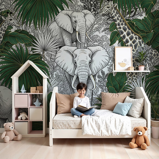 Pokaż wszystkie szczegółyTapety dla dzieci | Majestatyczne słonie i żyrafy w bujnej dżungli