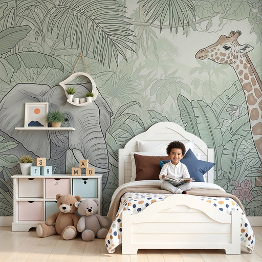 KidsWallPrzeorganizuj pokój swojego dziecka w prawdziwe sanktuarium natury z tą tapetą dla dzieci przedstawiającą majestatycznego słonia i wdzięczną żyrafę...