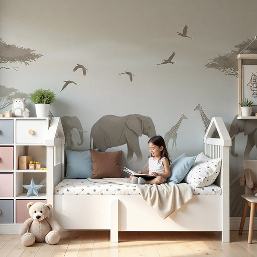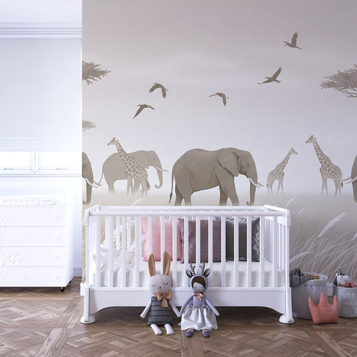 KidsWallPrzeorganizuj pokój swojego dziecka w prawdziwe safari z tą tapetą dla dzieci, na której przedstawione są majestatyczne słonie i eleganckie żyrafy ...