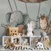 Wyrusz w fantastyczną podróż z tą tapetą dla dzieci, przedstawiającą ciekawskie zwierzęta unoszące się w powietrzu w balonie. Słoń, krowa i żyrafa zanurzone w czytaniu swoich książek, przemierzają wymarzone krajobrazy. Delikatna i kojąca ilustracja, która pobudzi wyobraźnię twojego małego dziecka.
