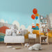 Obudź wyobraźnię swojego dziecka tym tapetą dla dzieci, przedstawiającą uroczą przygodę w kolorowym krajobrazie. Na łódce mała foka i uroczy kotek patrzą na niebo, trzymając jaskrawe balony. Faliste wzgórza w delikatnych odcieniach niebieskiego, pomarańczowego i żółtego tworzą zabawną i radosną scenerię.