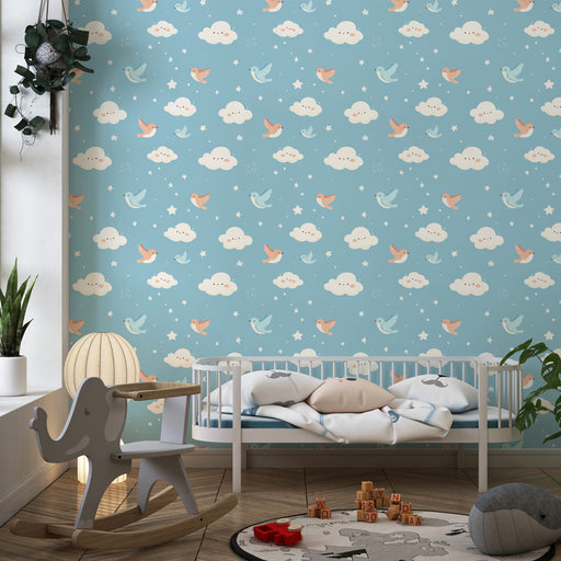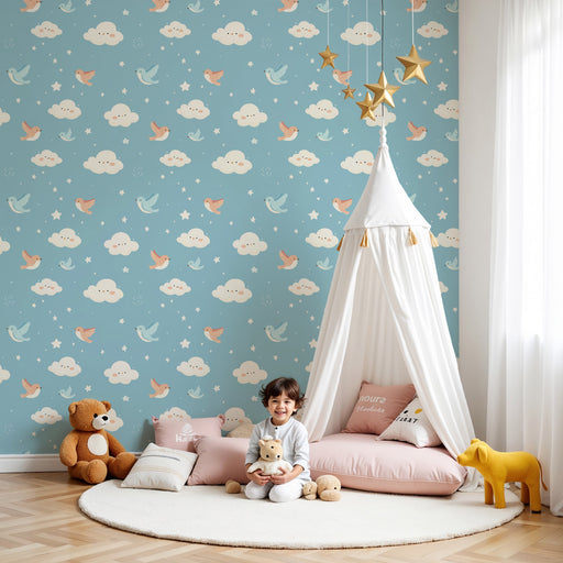 KidsWallStwórz miękką i radosną przestrzeń dla swojego dziecka za pomocą tego tapety dla dzieci, z ilustracją radosnych ptaków i miękkich chmur na kojącym ...