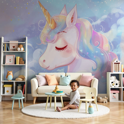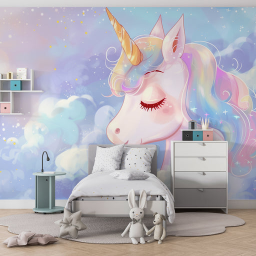 KidsWallUczynij pokój swojego dziecka wyjątkowym naszym tapetą dla dzieci, przedstawiającą śnieżnobiałego jednorożca śpiącego na chmurze, otoczonego migocz...