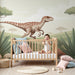Przeorganizuj pokój swojego dziecka w prawdziwą podróż w czasie z tą tapetą dla dzieci przedstawiającą dynamicznego dinozaura poruszającego się w prehistorycznym krajobrazie. Ten fascynujący motyw przedstawia dinozaura z charakterystycznymi pasami, który z radością biegnie przez zieloną dolinę otoczoną bujną roślinnością i skałami.