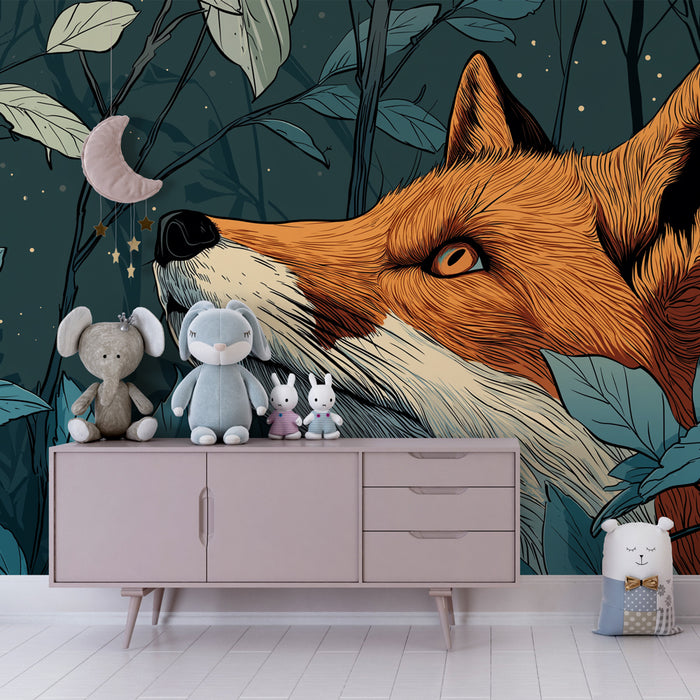 Lis, ze swoją błyszczącą sierścią i żywymi oczami, wyróżnia się na spokojnym tle, tworząc delikatną i kojącą atmosferę. Liście w odcieniach turkusowych i gwiaździste tła dodają odrobinę magii, zamieniając pokój w przestrzeń pełną nocnych przygód.