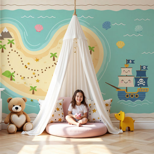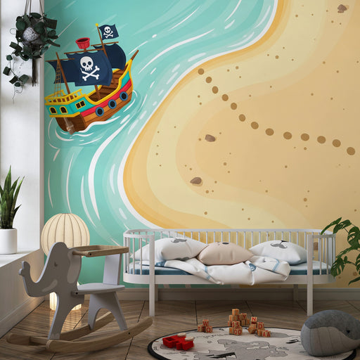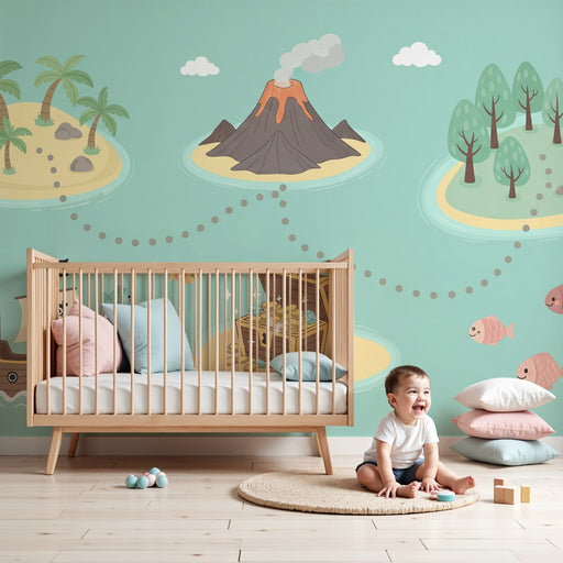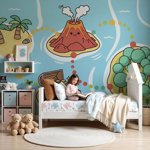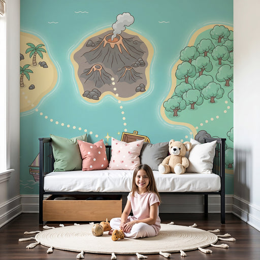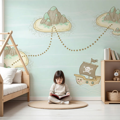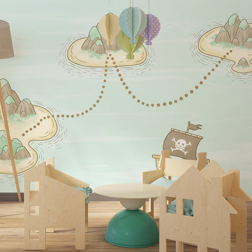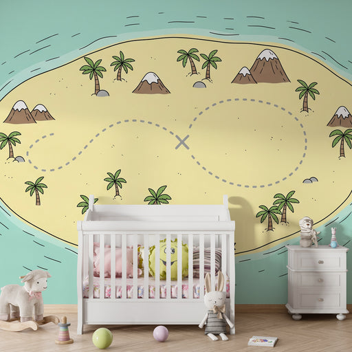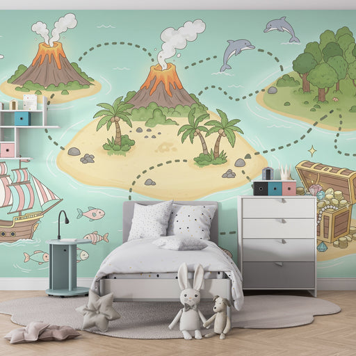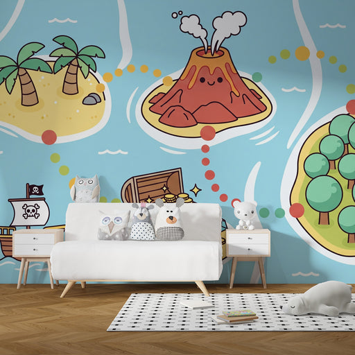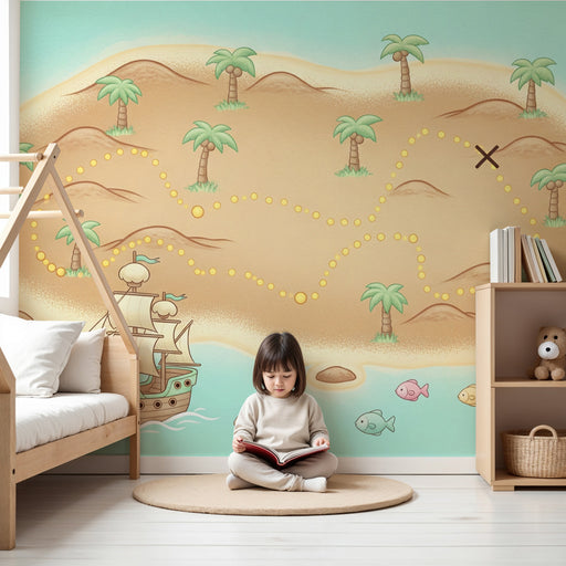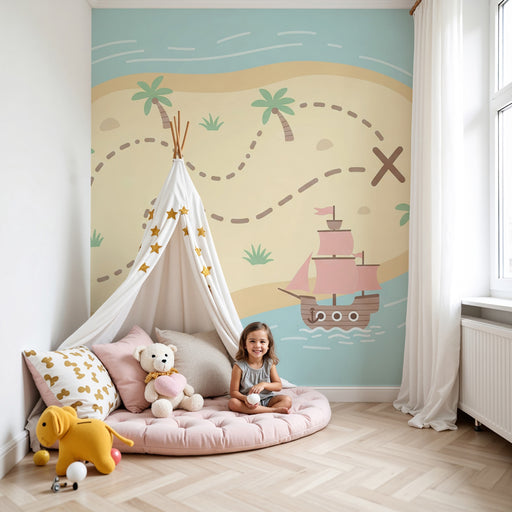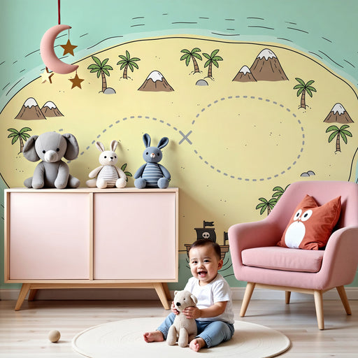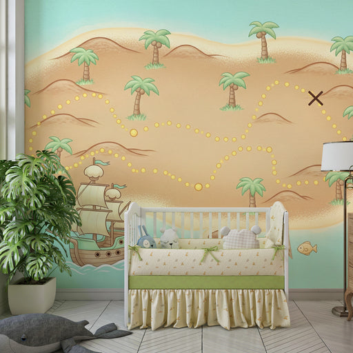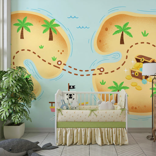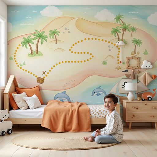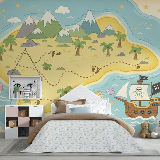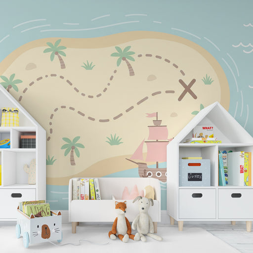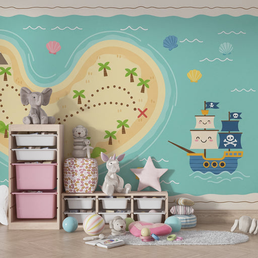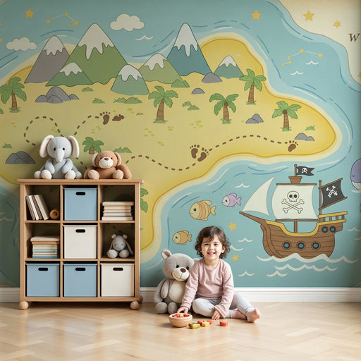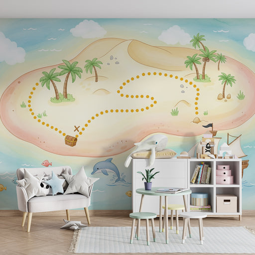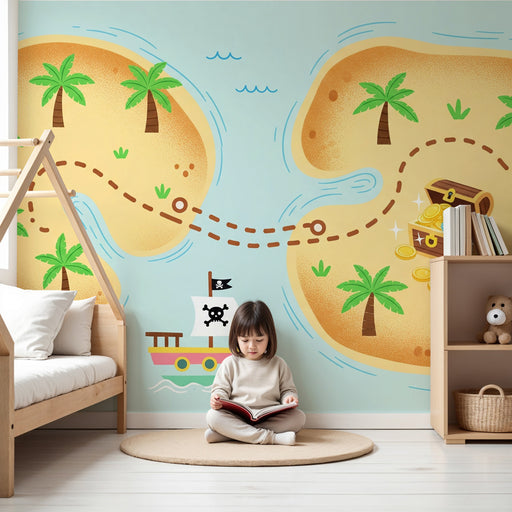 KidsWallWyrusz w ekscytującą przygodę z tym tapetą dla dzieci przedstawiającą skarb pirackiej mapy. Ta zabawna i kolorowa ilustracja przedstawia rajską wys...