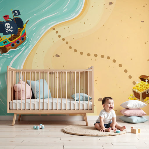 KidsWallPrzekształć pokój swojego dziecka w prawdziwą krainę przygód z tą tapetą inspirowaną piratami. Kolorowa ilustracja przedstawia mapę skarbów, przeci...