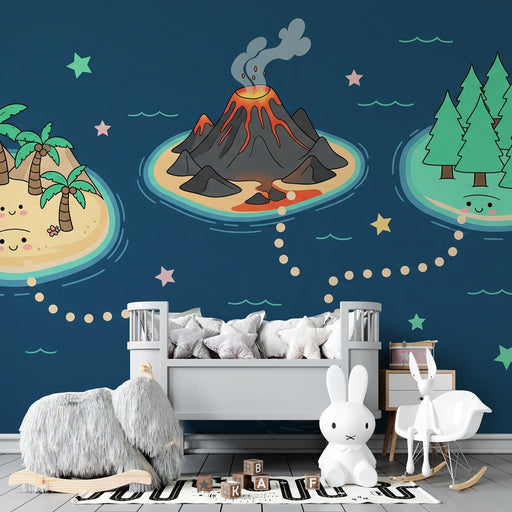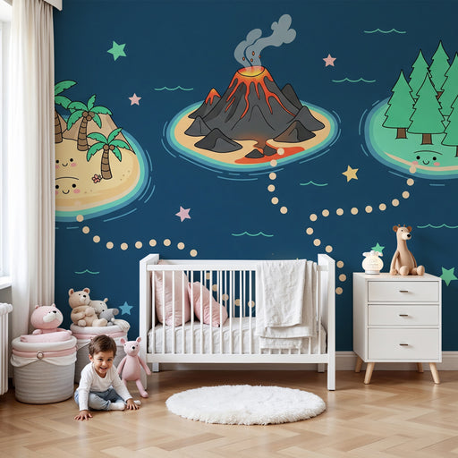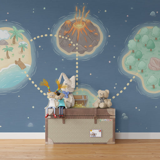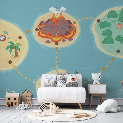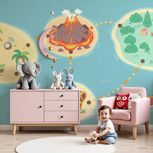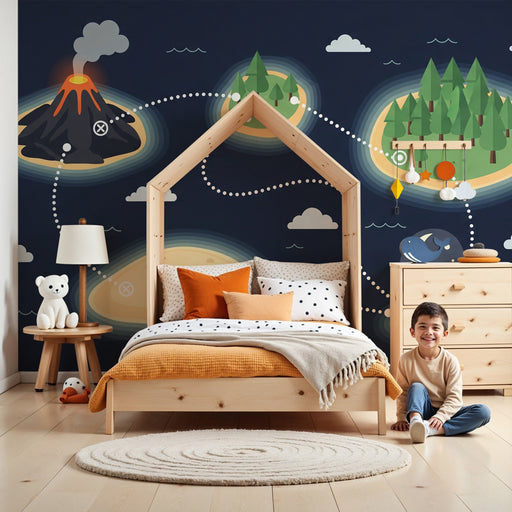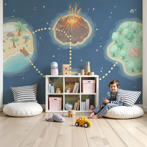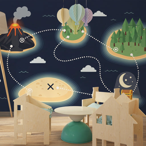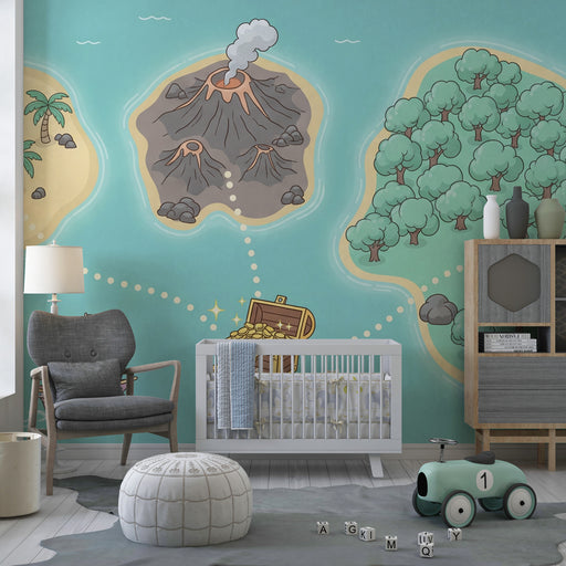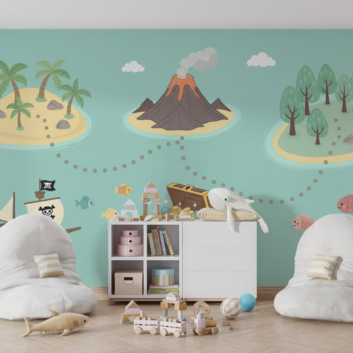 KidsWallWyrusz w niezwykłą przygodę z tym tapetą dla dzieci, przedstawiającą fascynującą mapę skarbów. Trzy intrygujące wyspy, każda z własnym urokiem: sło...