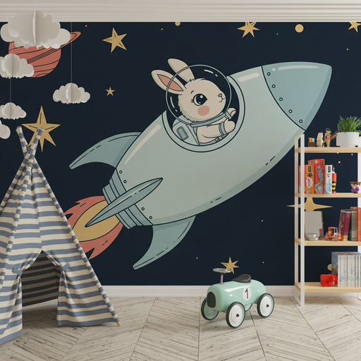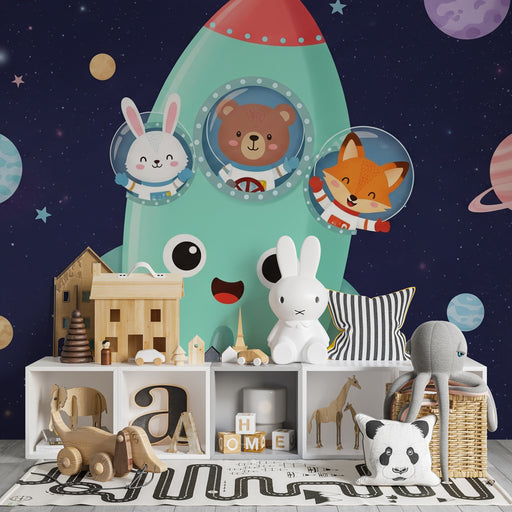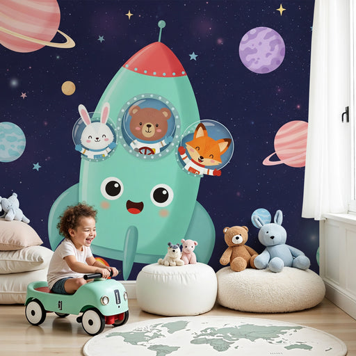 KidsWallWyrusz w międzygalaktyczną podróż z tym tapetą dla dzieci, na której przedstawiona jest urocza rakieta w towarzystwie swoich zwierzęcych przyjaciół...