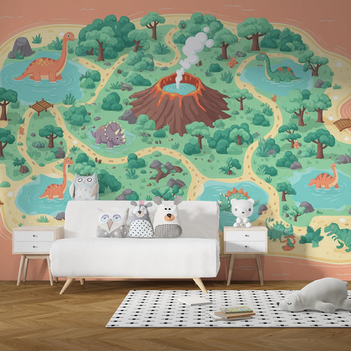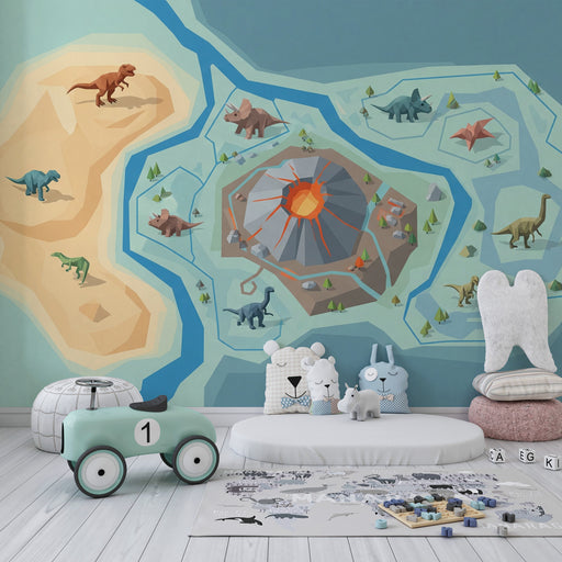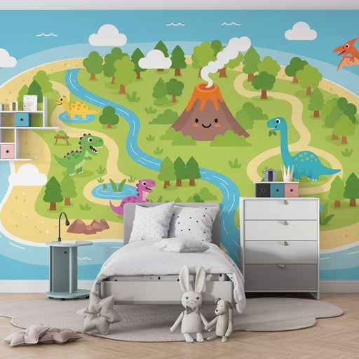 KidsWallPrzekształć pokój swojego dziecka w prawdziwy prehistoryczny raj za pomocą tego tapety z motywem dinozaurów. Na środku kolorowej wyspy, wulkan deli...