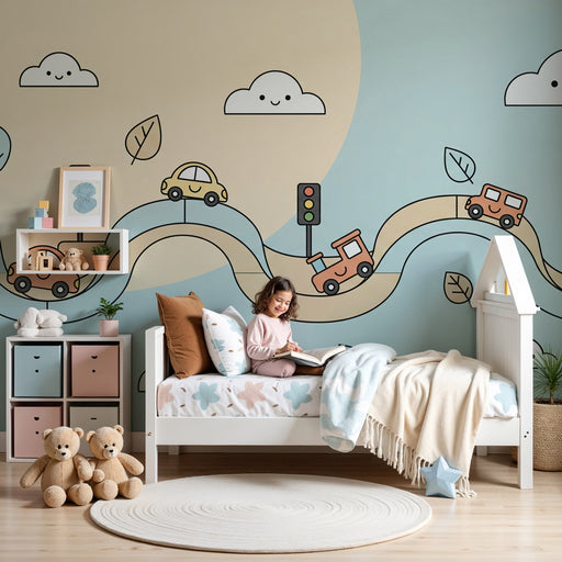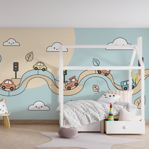 KidsWallPrzekształć pokój swojego dziecka w prawdziwe pole zabawy dzięki tej kolorowej tapetce, na której przedstawione są zabawne samochody na krętej drod...