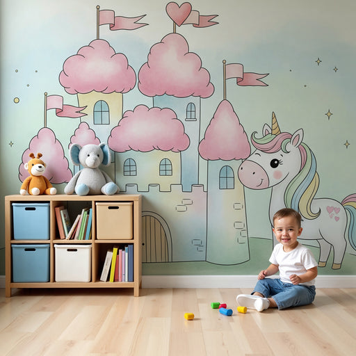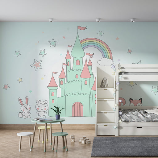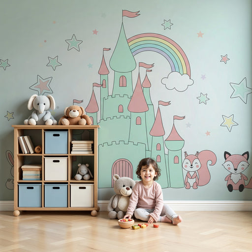 KidsWallPrzekształć pokój swojego dziecka w prawdziwe królestwo marzeń z tą tapetą dla dzieci, przedstawiającą zaczarowany zamek otoczony uroczymi zwierzęt...