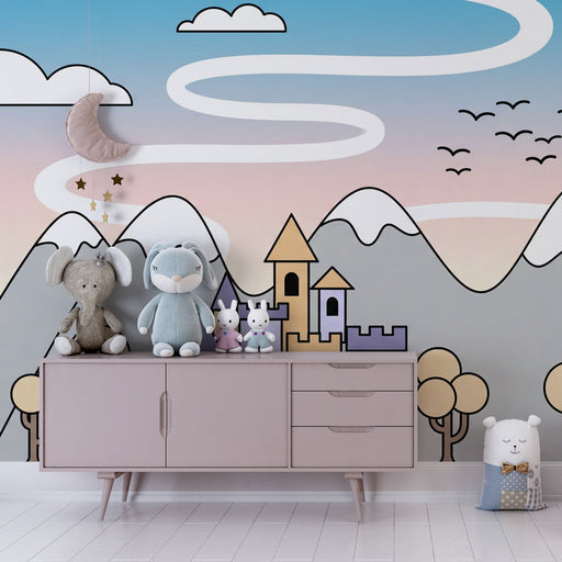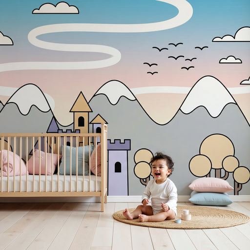 KidsWallWyrusz w magiczną przygodę z tą tapetą dla dzieci, przedstawiającą piękny zamek otoczony majestatycznymi górami. Sceneria, otoczona delikatnymi róż...
