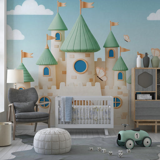 KidsWallWejdź do magicznego świata z tym tapetą dla dzieci przedstawiającą uroczy zamek z zielonymi wieżami, udekorowany pięknymi małymi flagami i otoczony...